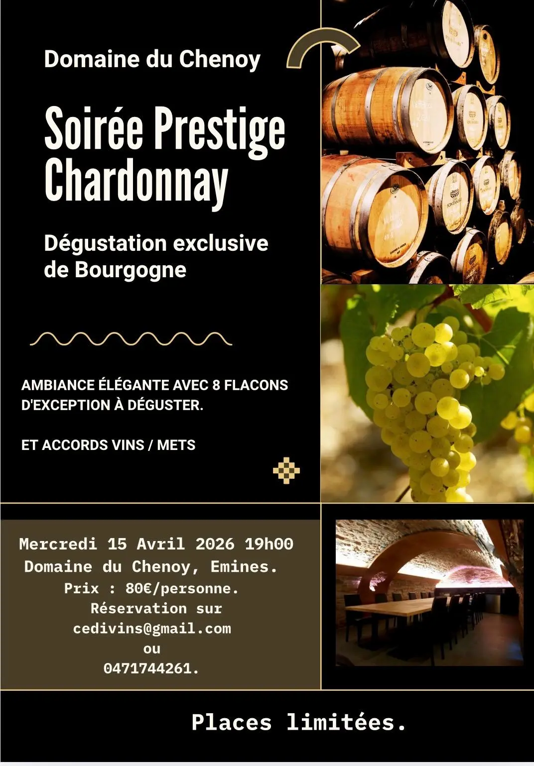 Plongez au cœur de la Bourgogne le temps d’une soirée d’exception. Le mercredi 15 avril 2026 à 19h00, Ced’I Vins vous invite au Domaine du Chenoy à Emines pour une dégustation prestige entièrement consacrée au chardonnay.